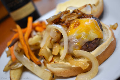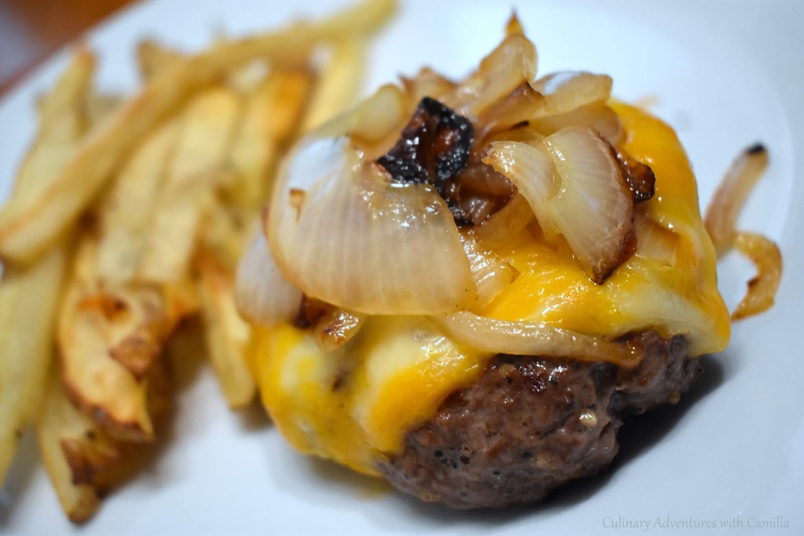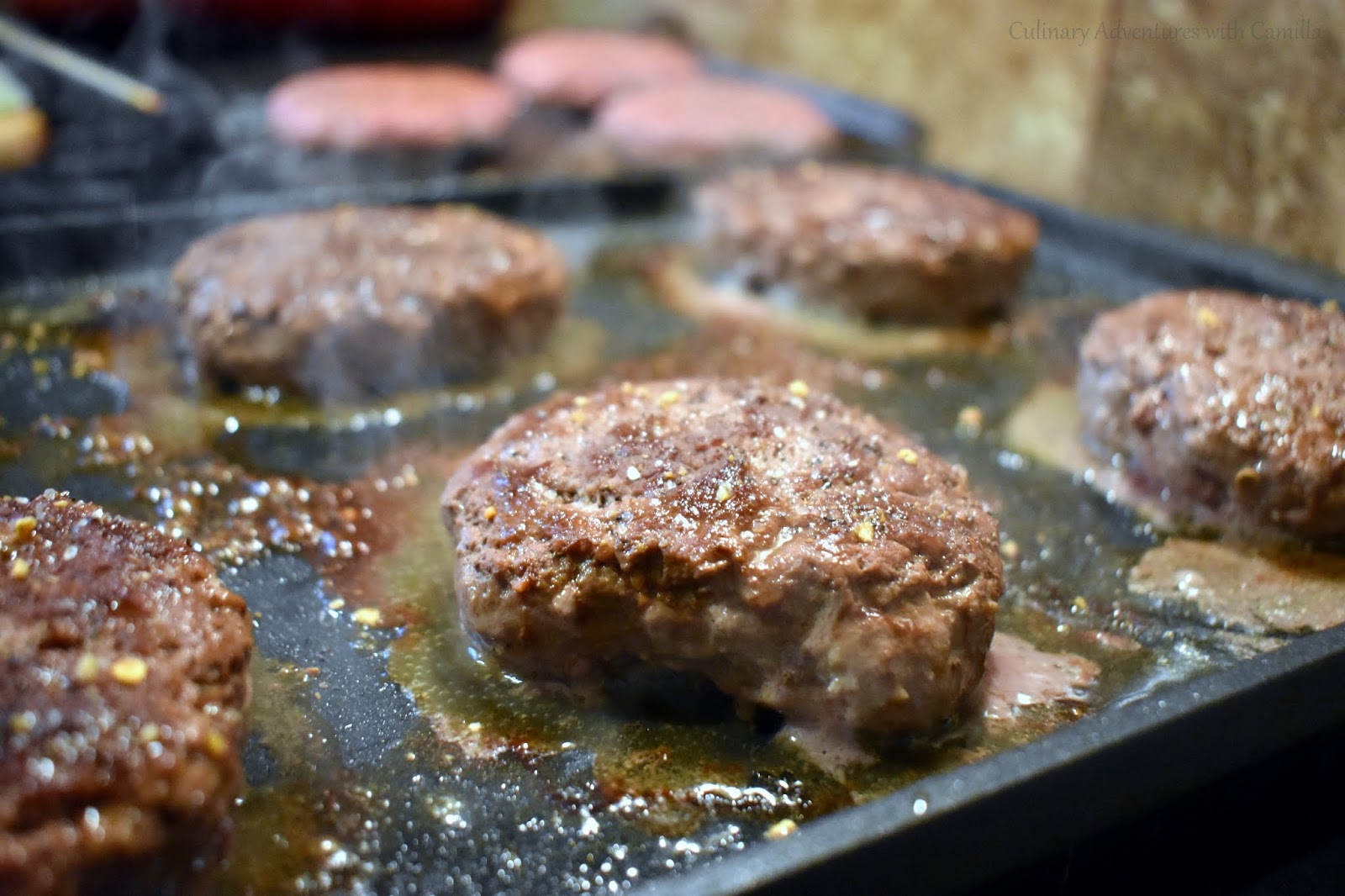 Just before the burgers are cooked, place a layer of cheese on top and heat until just melted. Place sliders on buns, if using. Top with sauted onions. Serve immediately.
