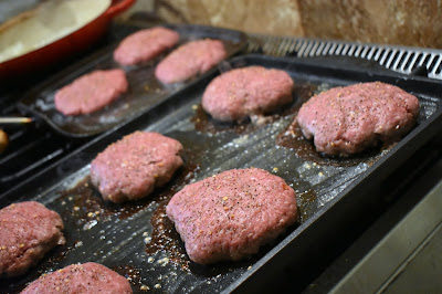 Add all of the ingredients - except the salt and pepper - to large mixing bowl. Mix until well-combined. Form the meat into 8 or 9 smaller patties. Place on a parchment-lined plate and set aside until ready to cook. Salt and pepper both sides, then cook to desired doneness on a grill or on the stove with grill pan or griddle.