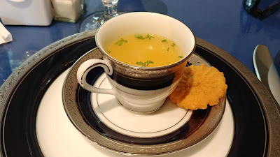 To start, Pumpkin Tea. The second course offered Mango Mint Hibiscus Tea and the third course offered Earl Grey Tea. It was fun to drink from a real teacup, something we never do at home because one, we're afraid of breaking my grandma's teacups, and two, a teacup is kind of small and we prefer large mugs of tea. Servers came around several times during each course to refill empty teacups, so there was plenty of tea.The first course was Harvest Chicken Consomme with Cheese Wafer. The wafer was delicious and had a bit of a spicy kick after you ate it.
